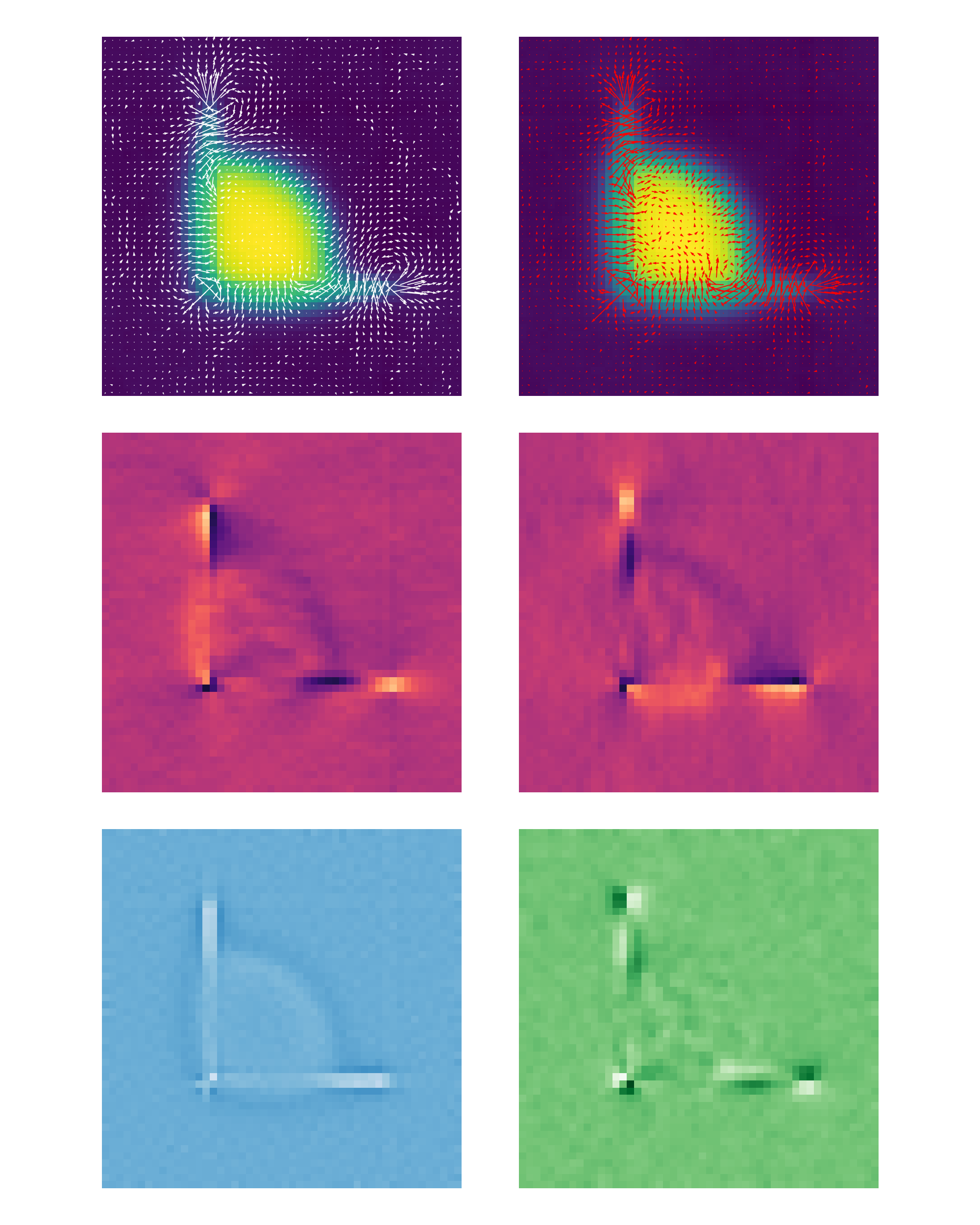 I then perform steady state averaging as well as averaging across the z direction (the thickness of these quasi-2d systems). I then compute the vector fields in the x, y plane overplayed with an average density profile, as well as the(z-averaged) $F_x,F_y$ components of the flow field and their divergence and curl.