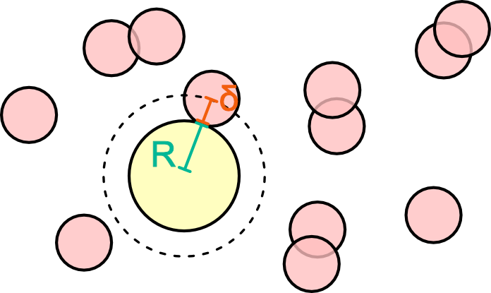 Introduce one colloid: the polymers cannot get closer than the distance R+\delta