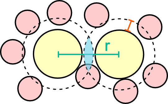 A second colloid is introduced at a short distance r. The exclusion regions overlap (light blue), increasing the accessible volume.