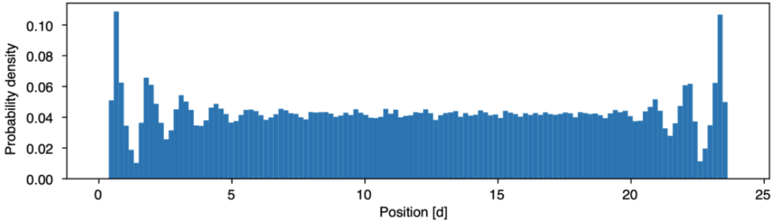 Investigate the probability distribution \rho(x) of finding the centre of a particle at position x. Parameters:
