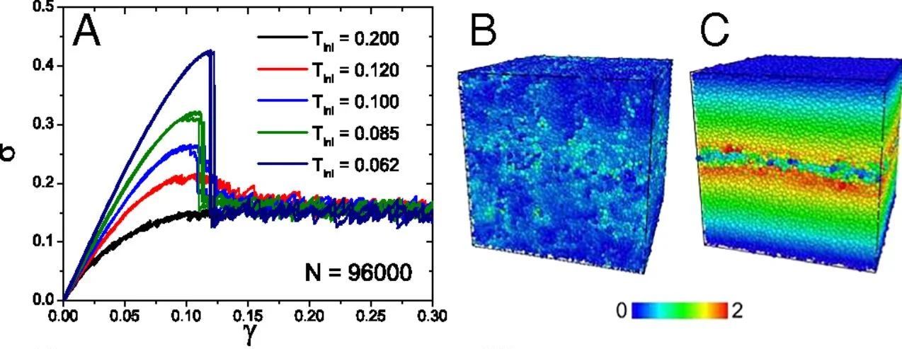 Example of brittle response in a simulated glassy model form Ozawa et al PNAS (2018): (a) stress-strain curves for different preparation temperatures; (b) initial deformation field, (b) final deformation field demonstrating fracture