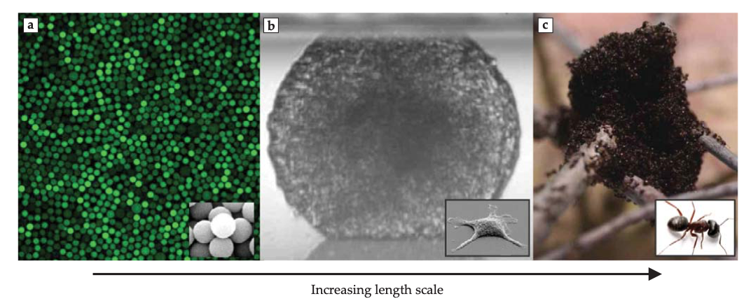 (a) Colloidal glasses, (b) dense cellular tissues, (c) ant colonies from Facets fo glassy physics, Berthier and Ediger, Physics Today (2016)