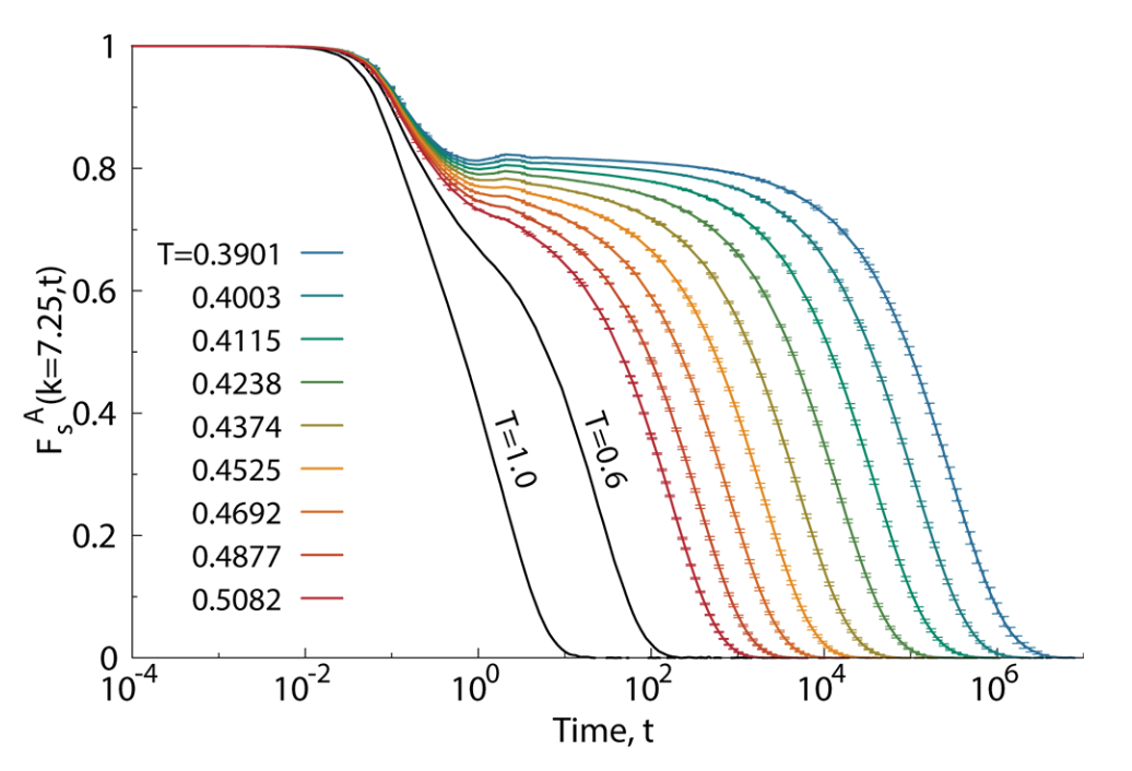 We quantify this with density autocorrelation functions such as the intermediate scattering function: F(k, t) = \frac{1}{N} \left\langle \sum_{j=1}^{N} e^{i \mathbf{k} \cdot [\mathbf{r}_j(t) - \mathbf{r}_j(0)]} \right\rangle