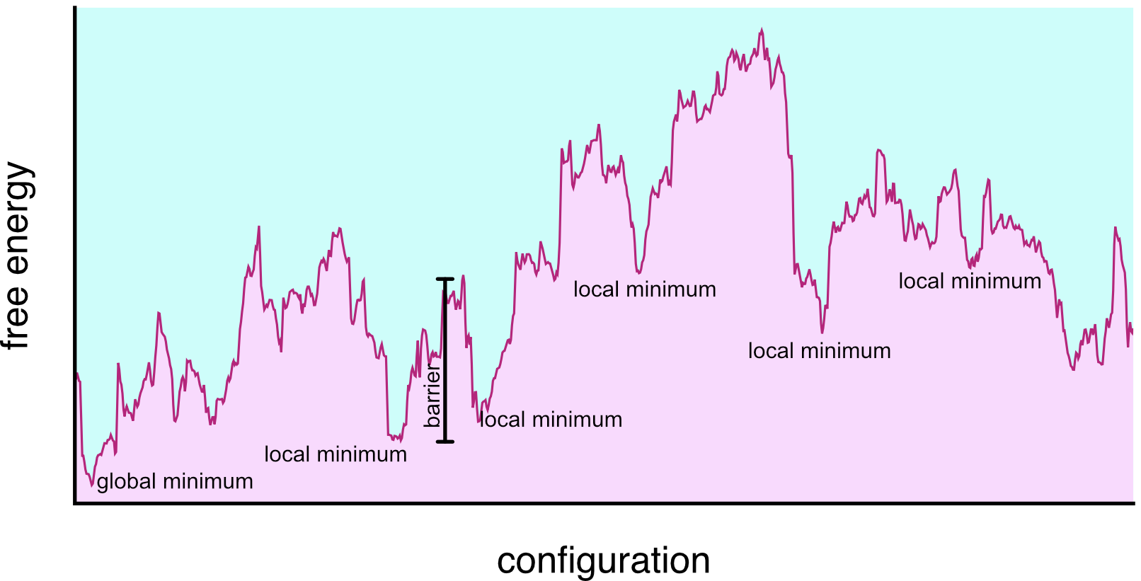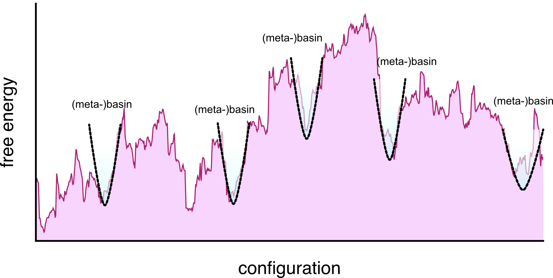 When the temperature allows it, connected minima can be grouped into single basins called metabasins.