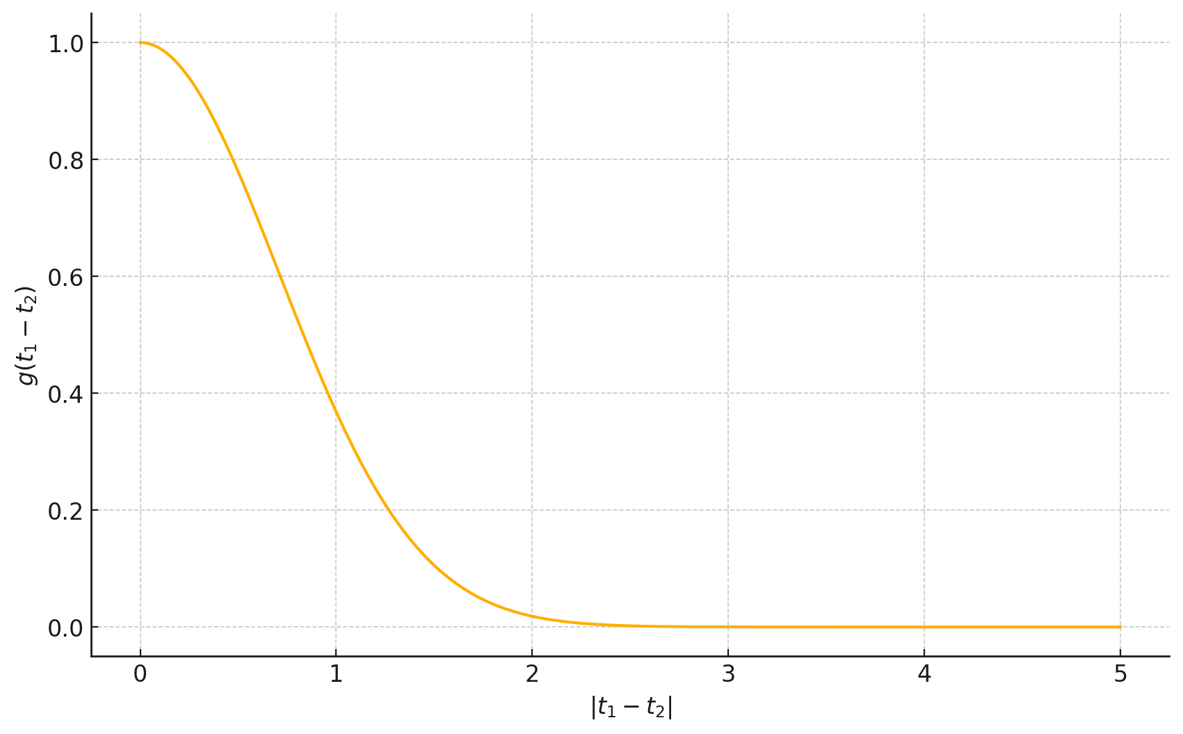 Figure 9.1: Sketch of \(g(t_1−t_2)\) against \(|t_1− t_2|\)