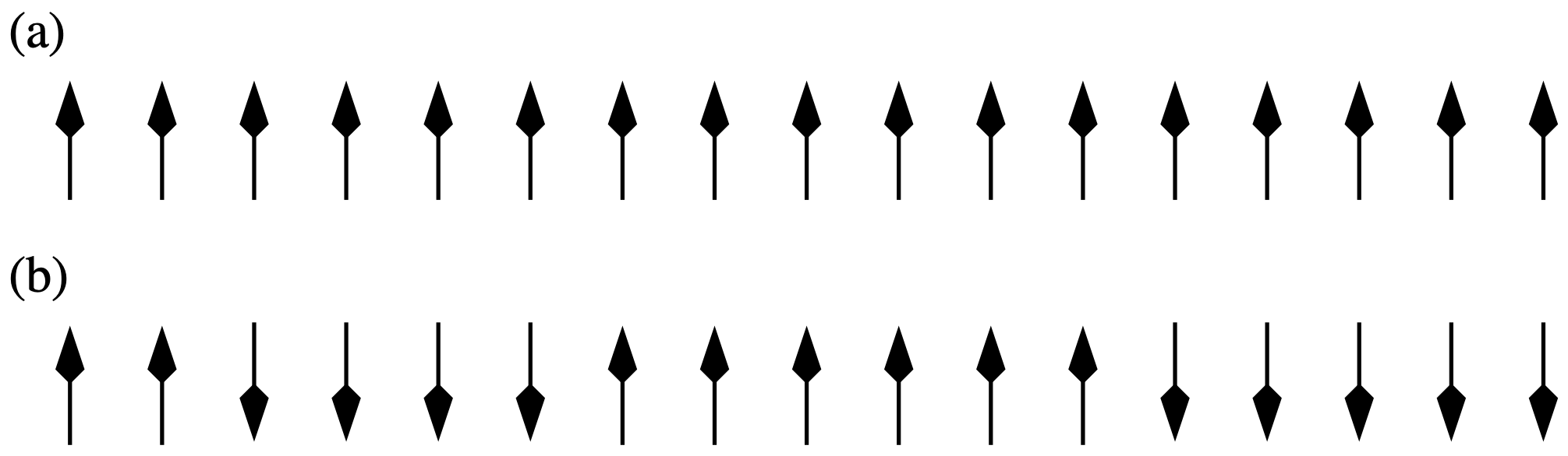Figure 4.2: (a) Schematic of an Ising chain at \(T=0\). (b) At a small finite temperature the chain is split into domains of spins ordered in the same direction. Domains are separated by notional domain “walls”, which cost energy \(\Delta=2J\). Periodic boundary conditions are assumed.