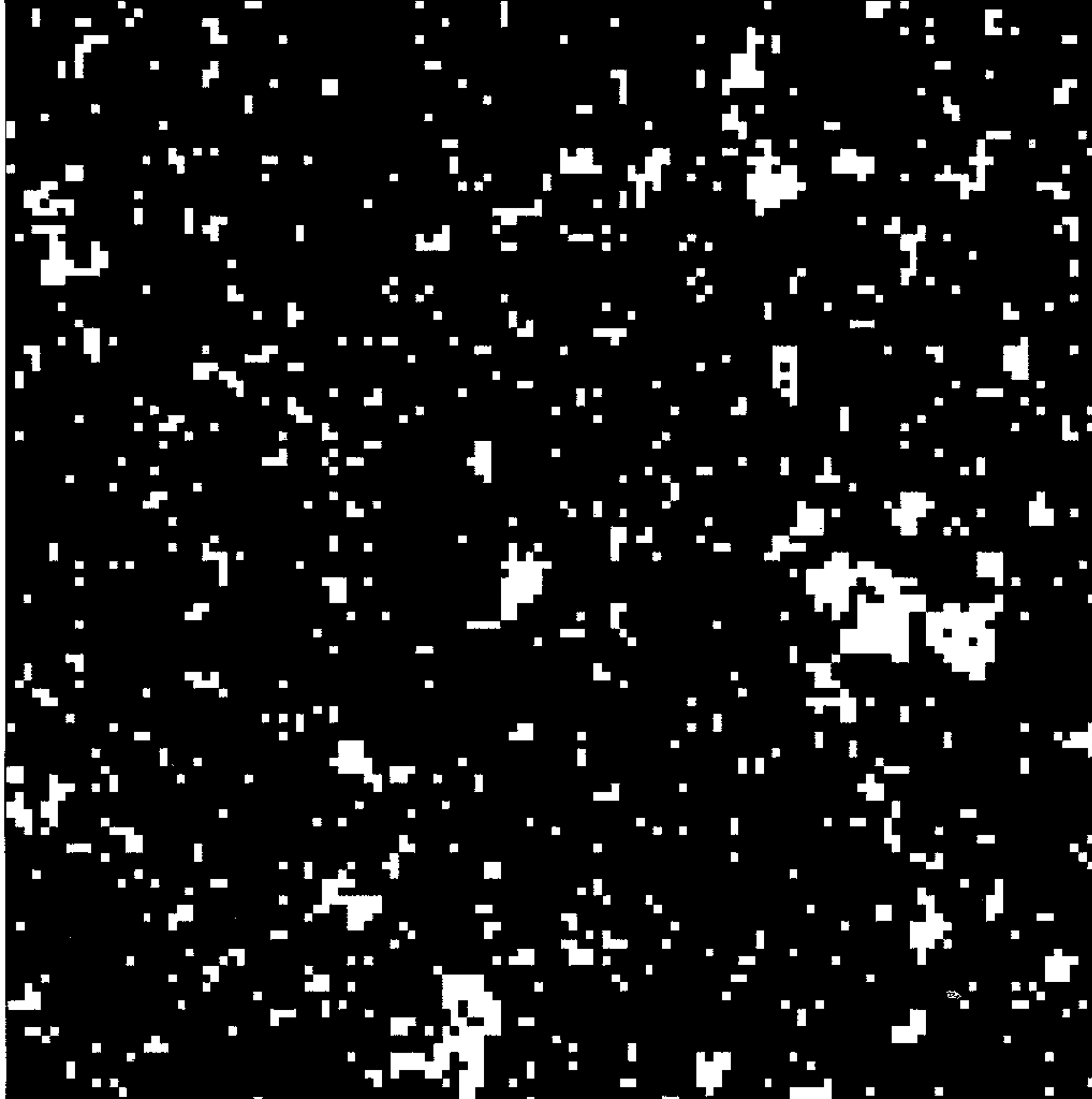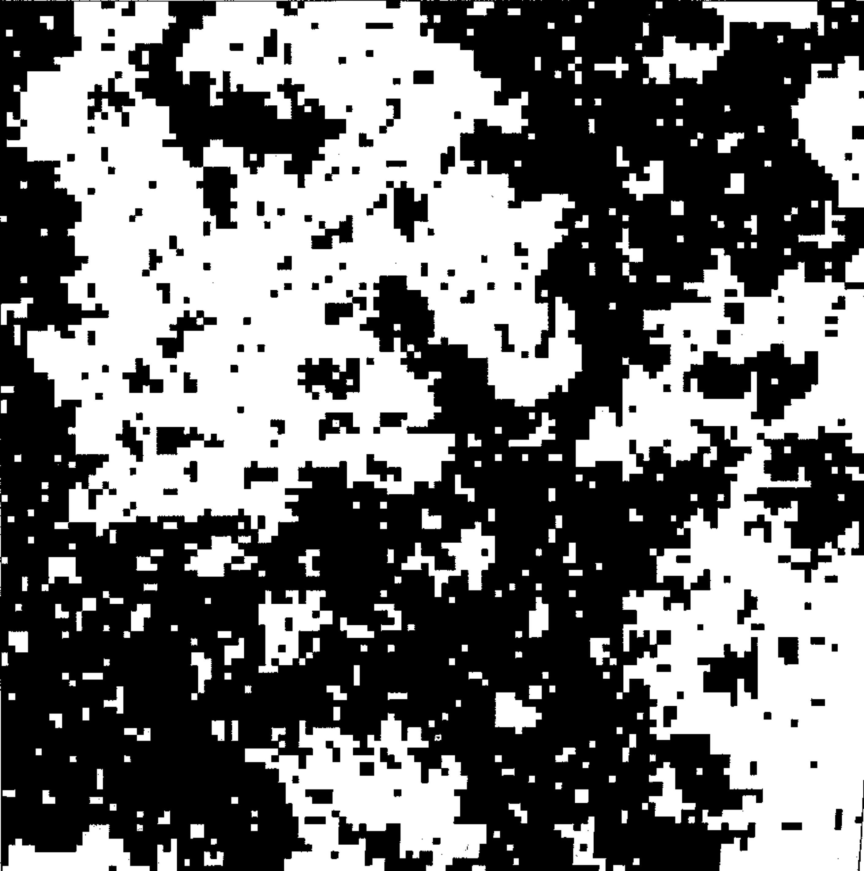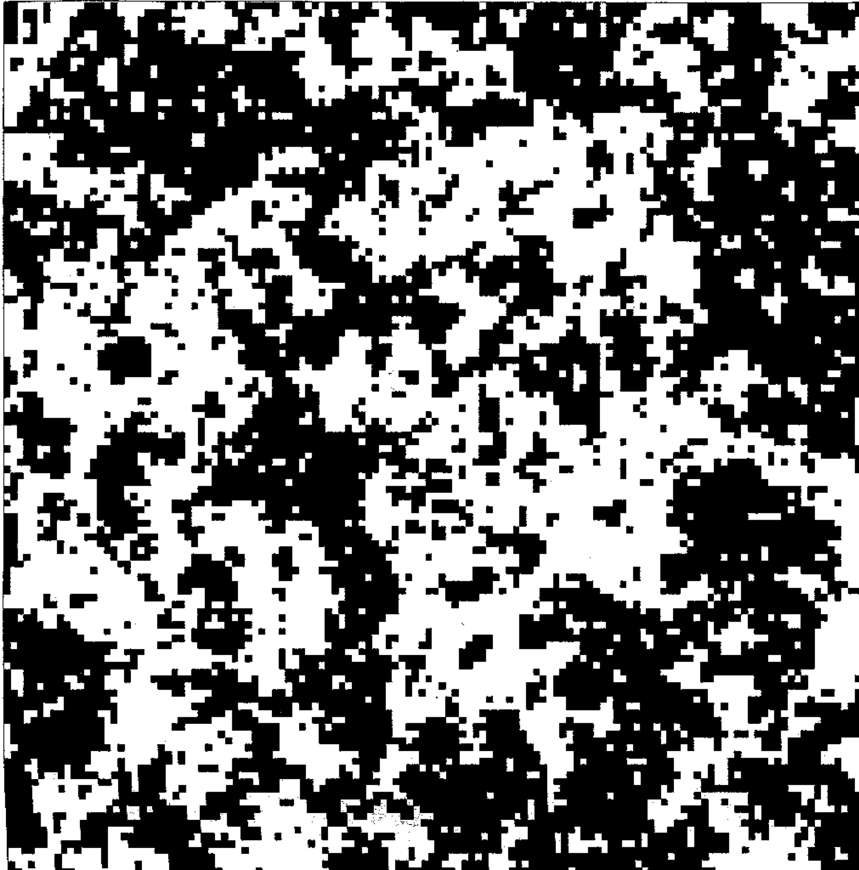 Figure 4.1: Configurations of the 2d Ising model. The patterns depict typical arrangements of the spins (white=+1, black=−1) generated in a computer simulation of the Ising model on a square lattice of \(N=512\) sites, at temperatures (from left to right) of \(T= 1.2T_c\), \(T=T_c\), and \(T=0.95T_c\). In each case only a portion of the system containing \(128\) sites in shown. The typical island size is a measure of the correlation length \(\xi\): the excess of black over white (below \(T_c\) is a measure of the order parameter.