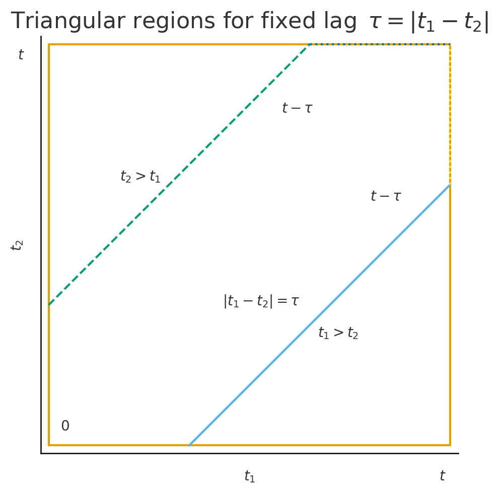 Now for fixed \(\tau = |t_1 - t_2|\), the square \([0,t]^2\) splits into two equal triangles: one where \(t_1 > t_2\) and one where \(t_2 > t_1\).