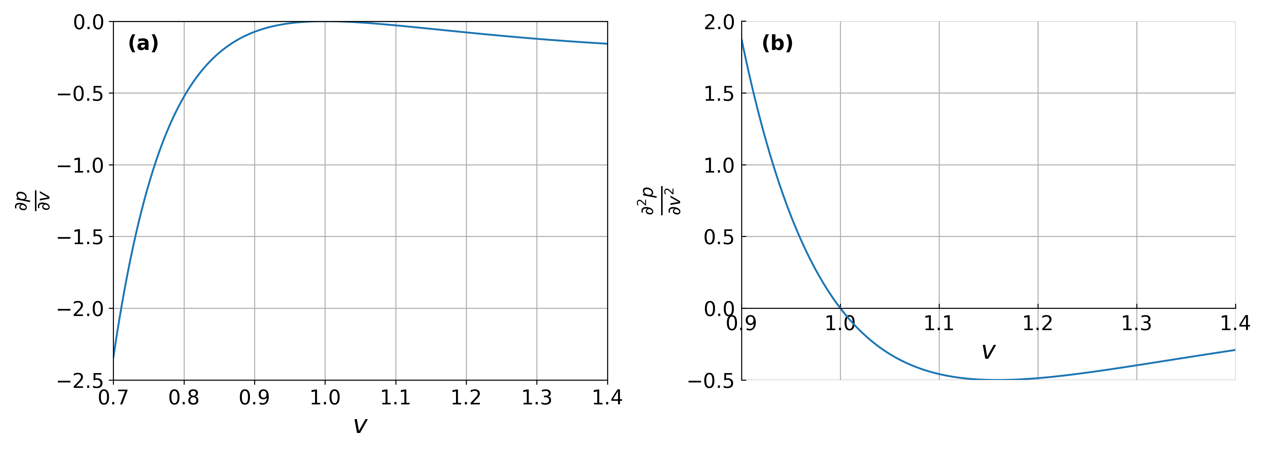 Plotting \((\frac{\partial p}{\partial v})_{t=1}\) and \((\frac{\partial^2 p}{\partial v^2})_{t=1}\), we see that there is indeed a point of inflexion on the critical isotherm, at \(v=1\), this is the critical point (ie. a continuous phase transition), Figure 3 .