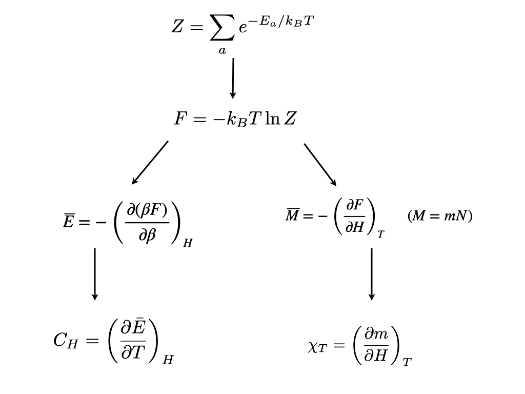 where \(F\) is the “Helmholtz free energy”. All thermodynamic observables, for example the order parameter \(Q\), and response functions such as the specific heat or magnetic susceptibility are obtainable as appropriate derivatives of the free energy. For instance, utilizing Equation 2.2, one can readily verify (try it as an exercise!) that the average internal energy is given by