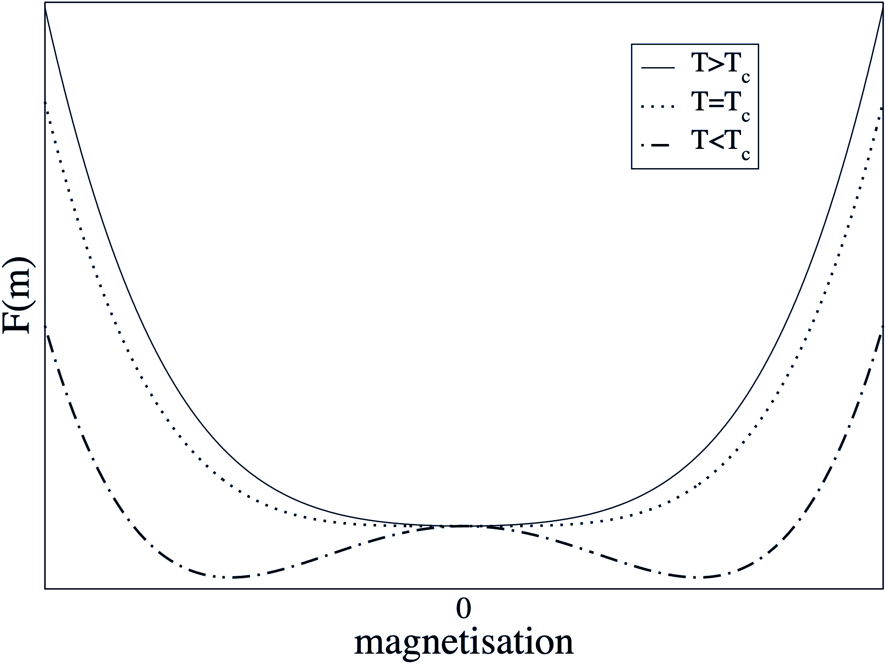 \[\frac{\partial^2 F}{\partial m^2}=0.\] At lower temperature, there are instead two minima at nonzero \(m=\pm m^\star\), where the equilibrium magnetisation \(m^\star\) is the positive root (calculated explicitly below) of