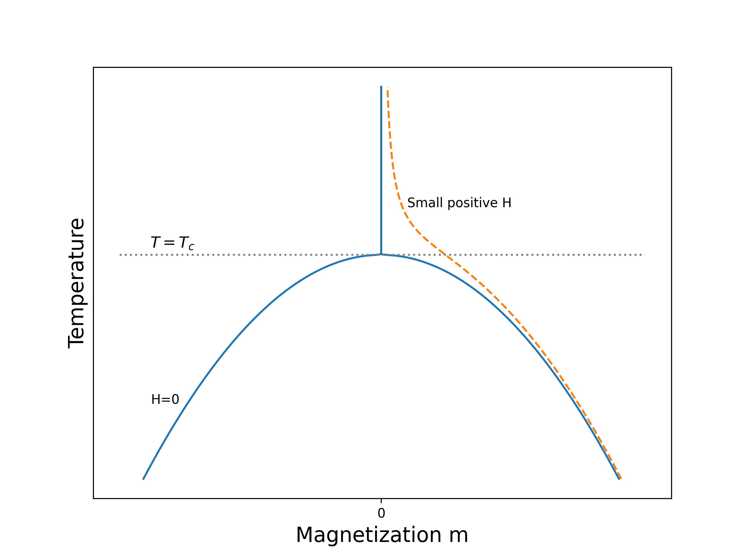 Note that at the critical point, a small applied field causes a very big increase in magnetisation; formally, \((\partial m/\partial H)_T\) is infinite at \(T=T_c\).