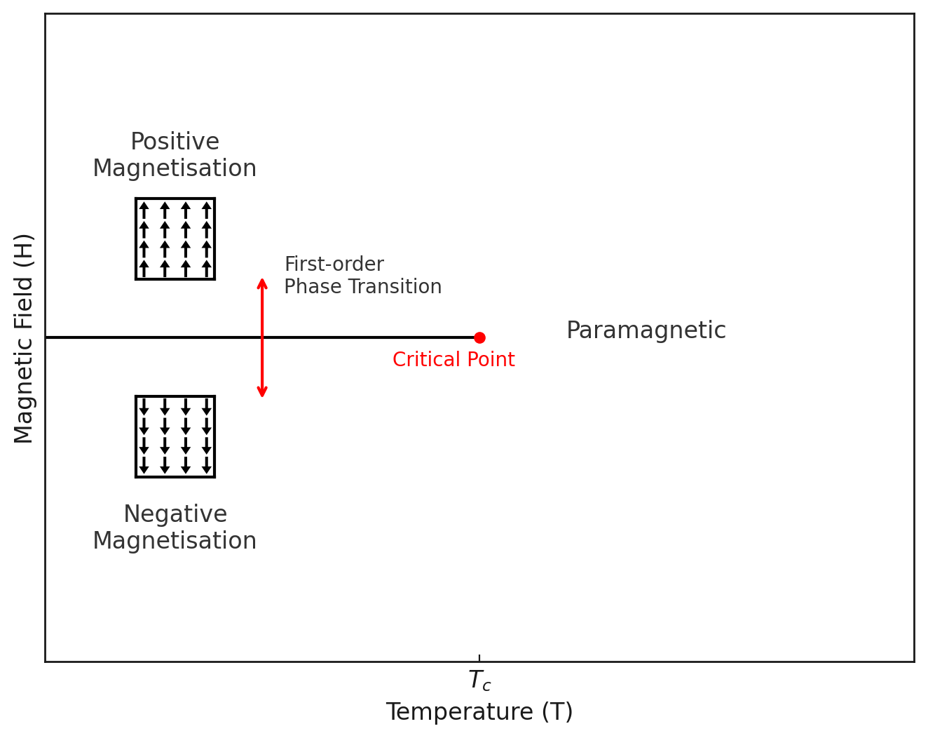In this terminology, we can say that the phase diagram of the magnet in the \(H,T\) plane shows a line of first order phase transitions, terminating at a continuous transition, which is the critical point.