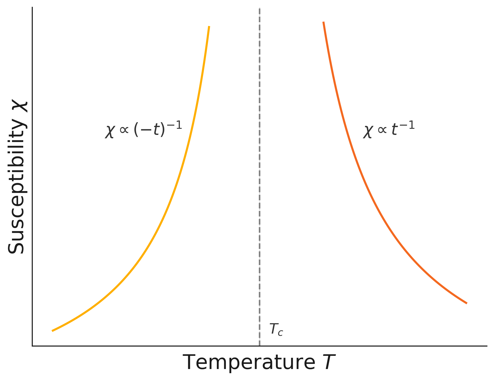 \[\chi=\left(\frac{\partial m}{\partial H}\right)_{T,V} \sim |T-T_c|^{-\gamma}\]