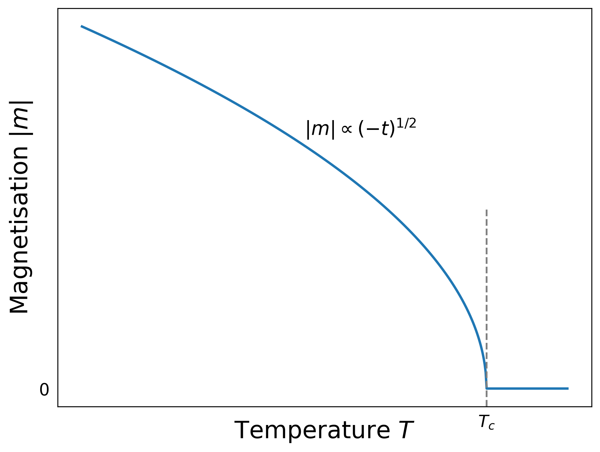 We have already seen examples of these in earlier sections, e.g., for the liquid-gas transition this was \[ \rho_{liq} - \rho_{gas}: \quad \textrm{difference in density of two coexisting phases}, \] while for the Ising magnet it is the magnetisation \(m\). Both quantities vanish at the critical point. These are examples of scalar order parameters – a single number is required to represent the degree of order (\(n = 1\)).