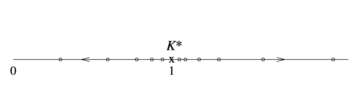 \[ \begin{aligned} K^\prime =& (K^*)^2 +(K-K^*)\left.\frac{\partial K^\prime}{\partial K}\right|_{K=K^*}+\frac{1}{2}(K-K^*)^2\left.\frac{\partial^2 K^\prime}{\partial K^2}\right|_{K=K^*}+\ldots\nonumber\\ K^\prime - K^* =& 2 (K - K^*)+ (K - K^*)^2 \end{aligned} \]