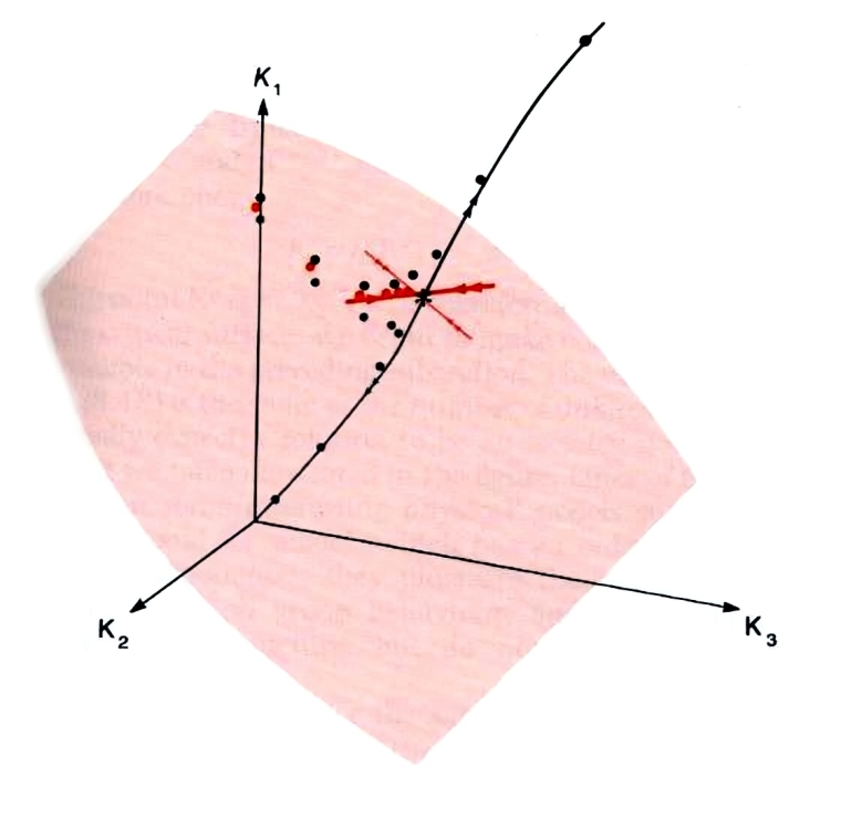 Figure 7.7 is a representation of the space of all coupling strengths \(K_a\) in the energy function \({\cal H}/k_BT\). This is of course actually a space of infinite dimension, but representing three of these, as we have done, enables us to illustrate all the important aspects. First let us be clear what the points in this space represent. Suppose we have some magnetic material which is described by a given set of exchange constants \(J_1,J_2,J_3.....\) As the temperature \(T\) varies, the coupling strengths \(K_a=J_a/k_BT\) trace out a straight line, or ray, from the origin of the space in the direction (\(J_1,J_2,J_3 ....\) ). Points on this ray close to the origin represent this magnet at high temperatures, and conversely points far from the origin represent the magnet at low temperatures. The critical point of the magnet is represented by a specific point on this ray, \(K_a= J_a/k_BT, a= 1,2,\dots\) The set of critical points on all of the possible rays forms a surface, the critical surface. Formally, it is defined by the set of all possible models (of the Ising type) which have infinite \(\xi\). It is shown schematically as the shaded surface in Figure 7.7. (In the figure it is a two-dimensional surface; more generally it has one dimension less than the full coupling constant space, dividing all models into high and low temperature phases.)