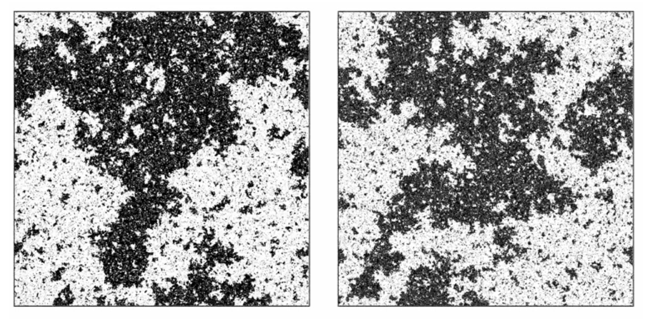 The physics of this regime is hard to tackle by analytic theory because it is characterized by configurational structure on all scales between \(L_\textrm{ min}\) and \(\xi\) (in fact it turns out that the near critical configurational patterns are fractal-like, cf. Figure 4.1 (b). Moreover different length scales are correlated with one another, giving rise to a profusion of coupled variables in any theoretical description. The window regime is also not easily accessed by computer simulation because it entails studying very large system sizes \(L_\textrm{ max}\), often requiring considerable computing resources.