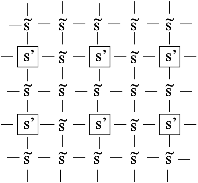 Consider an Ising model in two dimensions, with only nearest neighbour interactions as shown in Figure 7.5. We have divided the spins into two sets, the spins \(\{s^\prime\}\) form a square lattice of spacing \(2\), the others being denoted by \(\{\tilde{s}\}\). One then defines an effective energy function \({\cal H^\prime}\) for the \(s^\prime\) spins by performing an average over all the possible arrangements of the \(\tilde{s}\) spins