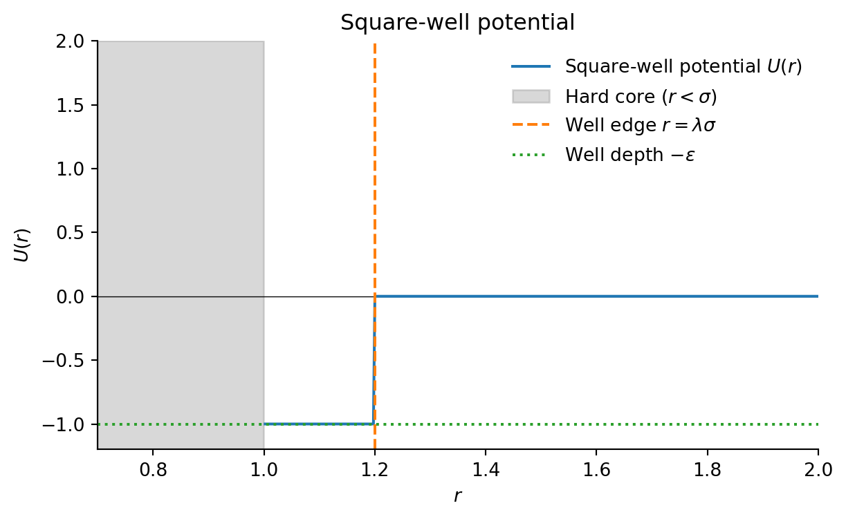 where \(\sigma\) is the particle diameter (hard core), \(\epsilon\) is the well depth (attractive strength), and \(\lambda\) controls the range of the attraction.