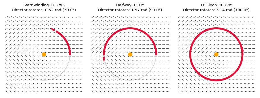 In two dimensions, the disclinations are characterized by a topological charge (or strength) \(s\), defined by the total rotation of the director around a closed loop enclosing the defect:
