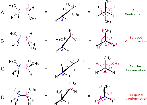 At low temperatures ( \(k_{B} T < {\mathrm {\text{configurational energy}}}\)) the configuration will thus be predominantly of type A (an anti conformation). As the temperature is increased ( \(k_{B} T \sim\) config. energy), there will also be C (gauche) configurations and at high temperatures ( \(k_{B} T \gg\) config. energy), any angle will be possible.