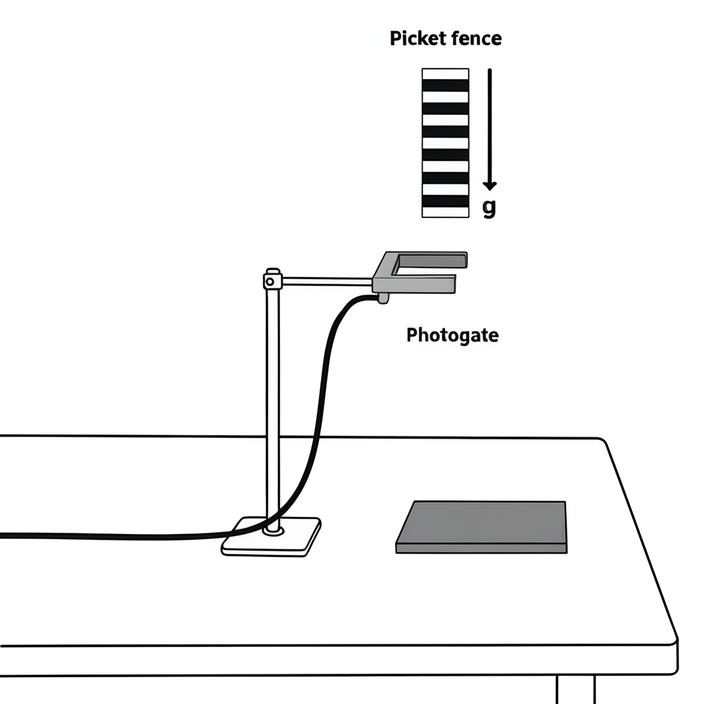 A classic experiment in introductory physics is the photogate picket fence experiment. In this setup, a picket fence (a clear plastic strip with evenly spaced opaque bars) is dropped vertically through a photogate sensor.